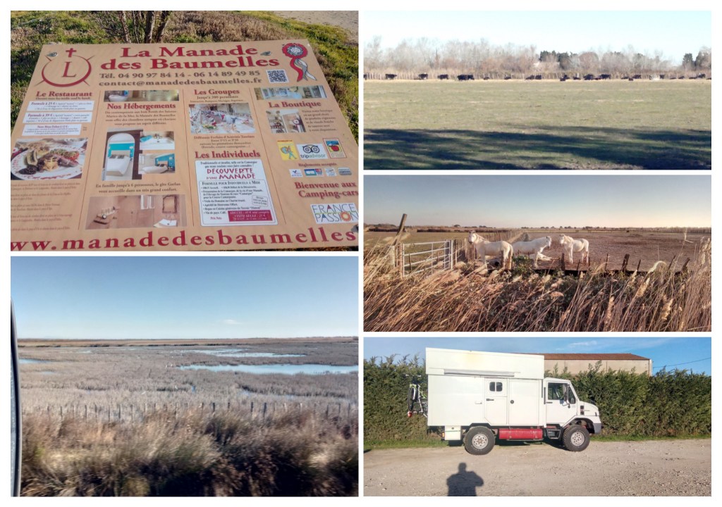 And further on towards the Camargue – a Rough but very Beautiful area known for their Beautiful horses. To drive the 200 km fast, we decided to take the Highway. Yes we met them, the Gilet Jaunes – yellow wests protesting against president Macron. They were all friendly to us. In fact, we even saved toll once as they have broken the toll payment Station. On the next toll Station they even broke the gate and around 25 Police officers were Standing there. Later we understood why: the Gilet Jaunes have announced further demonstrations from 3pm onwards. After 150km the Highway was over and we drove on side roads through the Wonderful landscape of Camargue. We drove through St. Marie de la Mer and then to our Stopover at Manade des Baumelles.