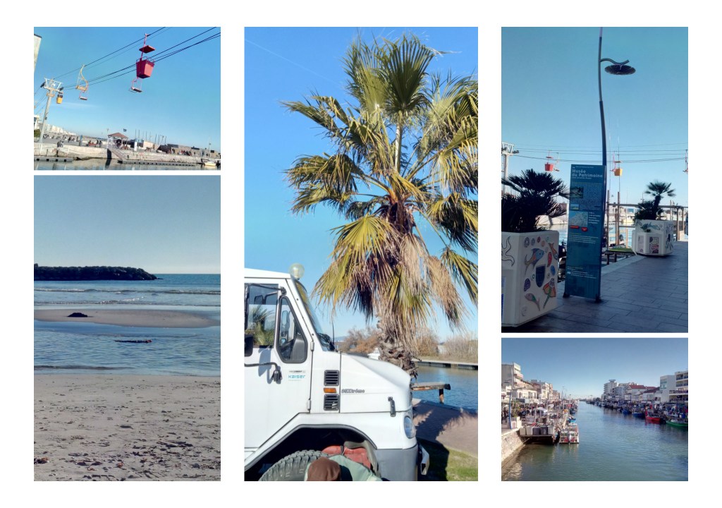Dank der Caramap App haben wir einen preisgünstigen Stellplatz mit Dusche gefunden und uns über die Nebenstrassen wieder auf den Weg gemacht – waren ja nur 37km durch die Camargue. Palavas-les-Flots liegt auf einer Landzunge. O wow – hier gibt’s Flamingos :o) – Fotos folgen. Das Dörfchen ist voll mit Bars, Restaurants und Souvenirgeschäften. Für Anfang Januar auch voll mit Leuten. Und wir haben eine Seilbahn entdeckt, die nicht für Skifahrer gemacht wurde ;o)