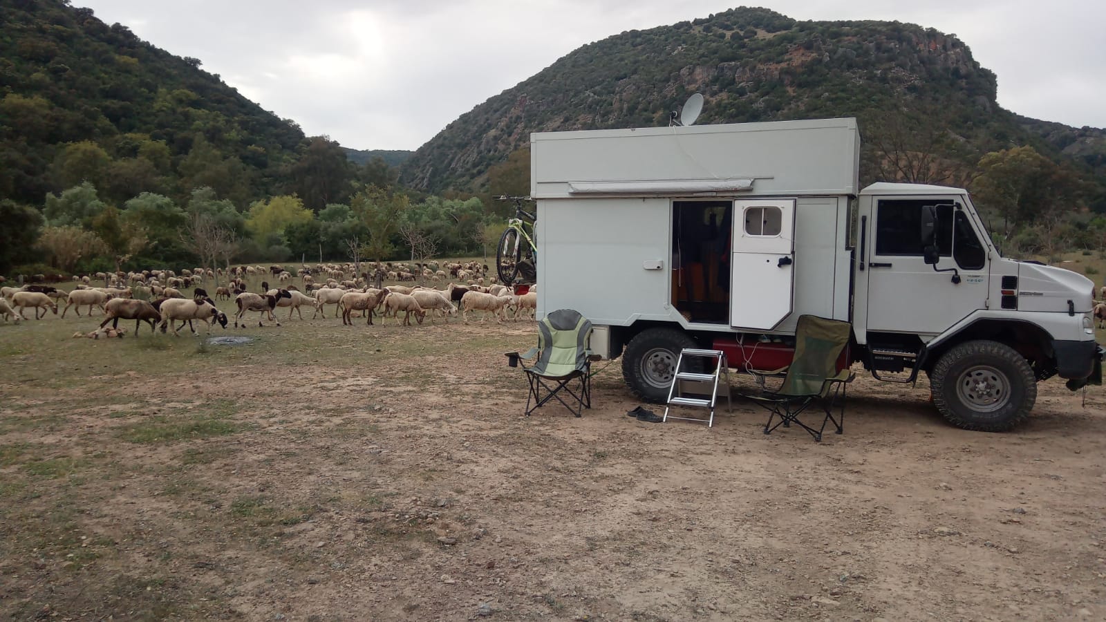 After Jerez we drove via Arcos de la Frontera, passing Los Sauces and Zahara de la Sierra towards Coripe. The Streets lead through curvy mountains – that’s familiar 😉 There we found our next place – Chaparro de la Vega. The navi guided us wrong – so had to do a u-turn. At the Estacion de Coripe we drove on over a gravel road and ended at a very nice picknick area next to a small Chapel. Later on the afternoon we got surrounded by sheeps and goats.