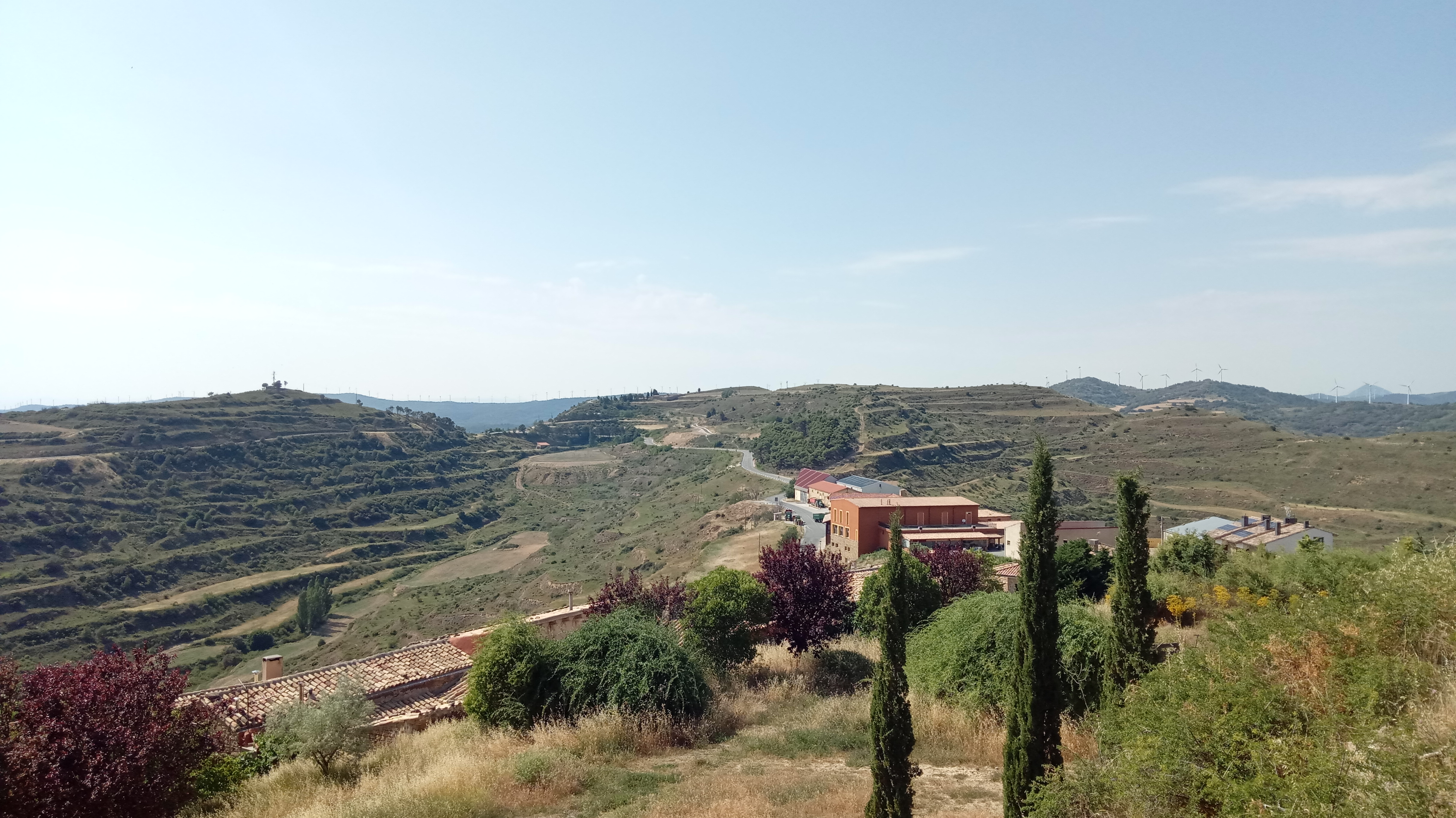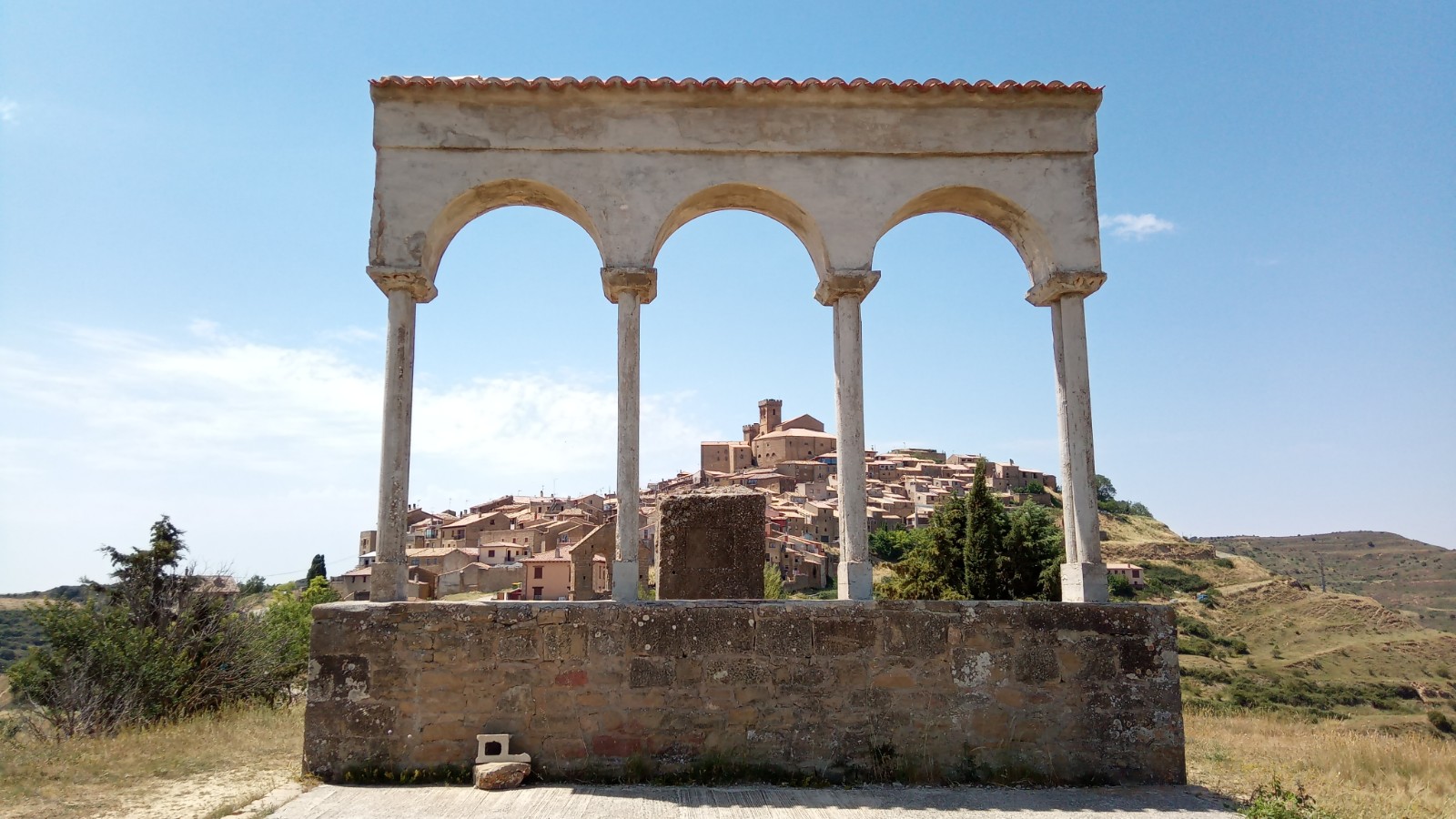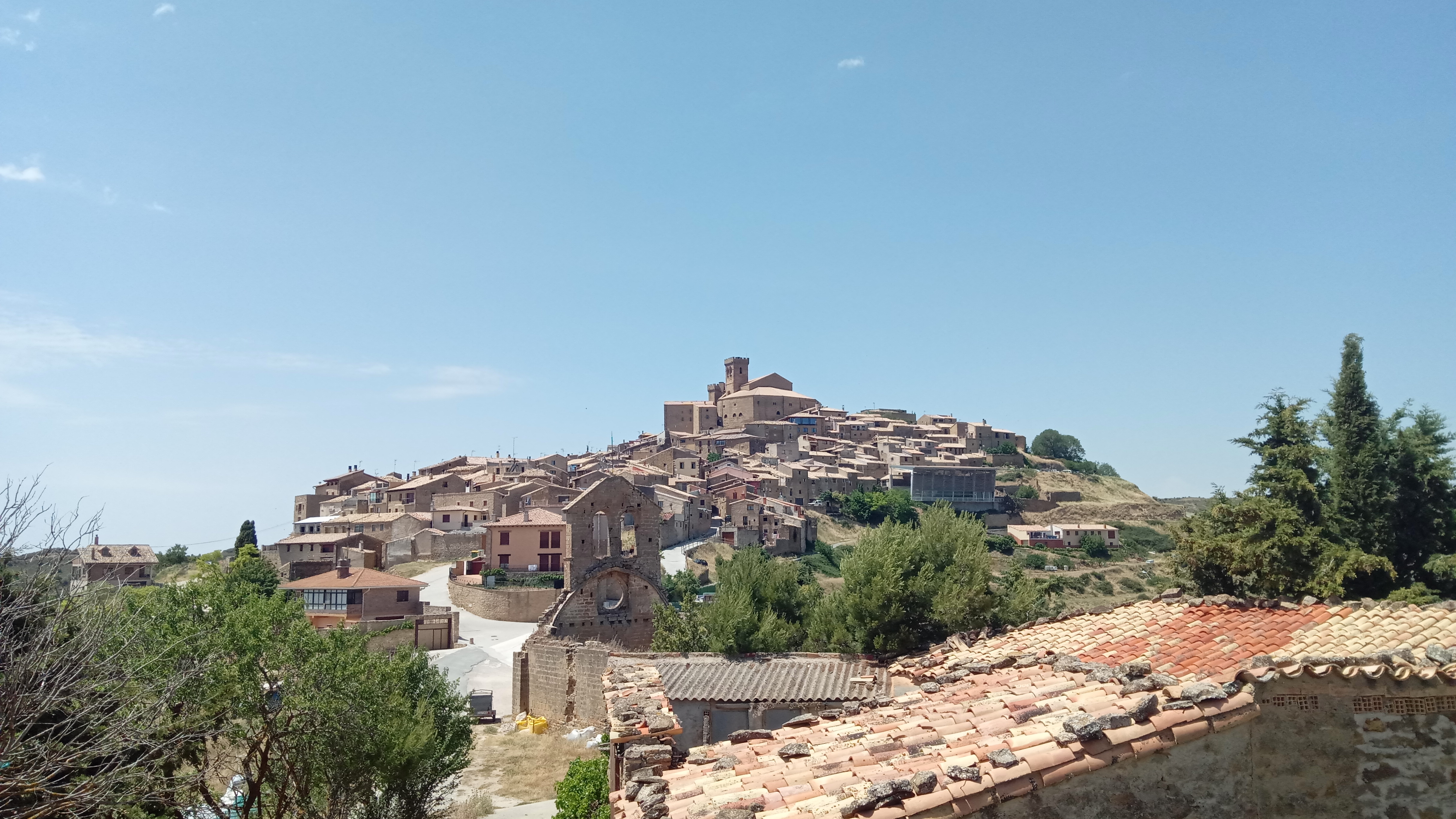 Selbstverständlich nehmen wir den Ratschlag der Polizisten gerne wahr und fahren weiter nach Ujué. Die Fahrt führt durchs Hinterland in die Höhe. Der Parkplatz liegt unter dem Dorf hinter einer alten Kirche. Die Aussicht ist der Hammer! Ausser dem Dorf nur Berge und terassenartige Felder. Richtig schön! Der Weg zum Dorf ist sehr steil – und die 34° machen es nicht einfacher – aber die kleinen Pflastersteinwege zwischen den wunderschönen Steinhäusern sind es auf jeden Fall wert. Die grosse Kirche Iglesia de Santa Maria stammt aus dem 16. Jahrhundert und kann kostenlos besichtigt werden. Die Aussicht ist wunderschön – das Gebäude sehr beeindruckend. Ujué hat 3 Restaurants in denen das klassische Migas del Pastor gegessen werden kann. Einen Souvenirshop gibt es natürlich auch. Dort können gebrannte Mandeln, Wein, Gebäck und geweihte Figuren gekauft werden. Ujué wurde als eines der schönsten Dörfer Spaniens ausgezeichnet – absolut zurecht!