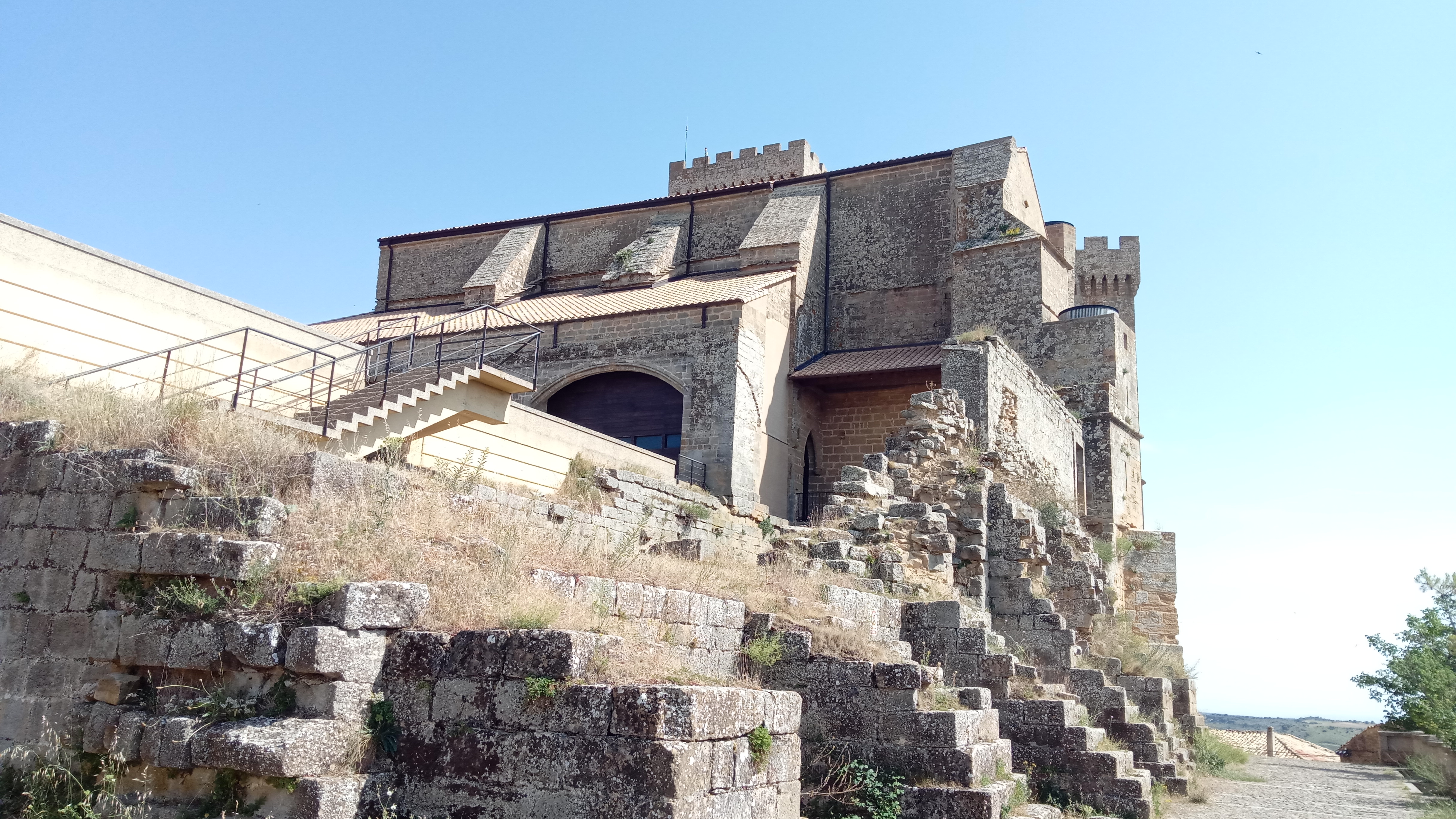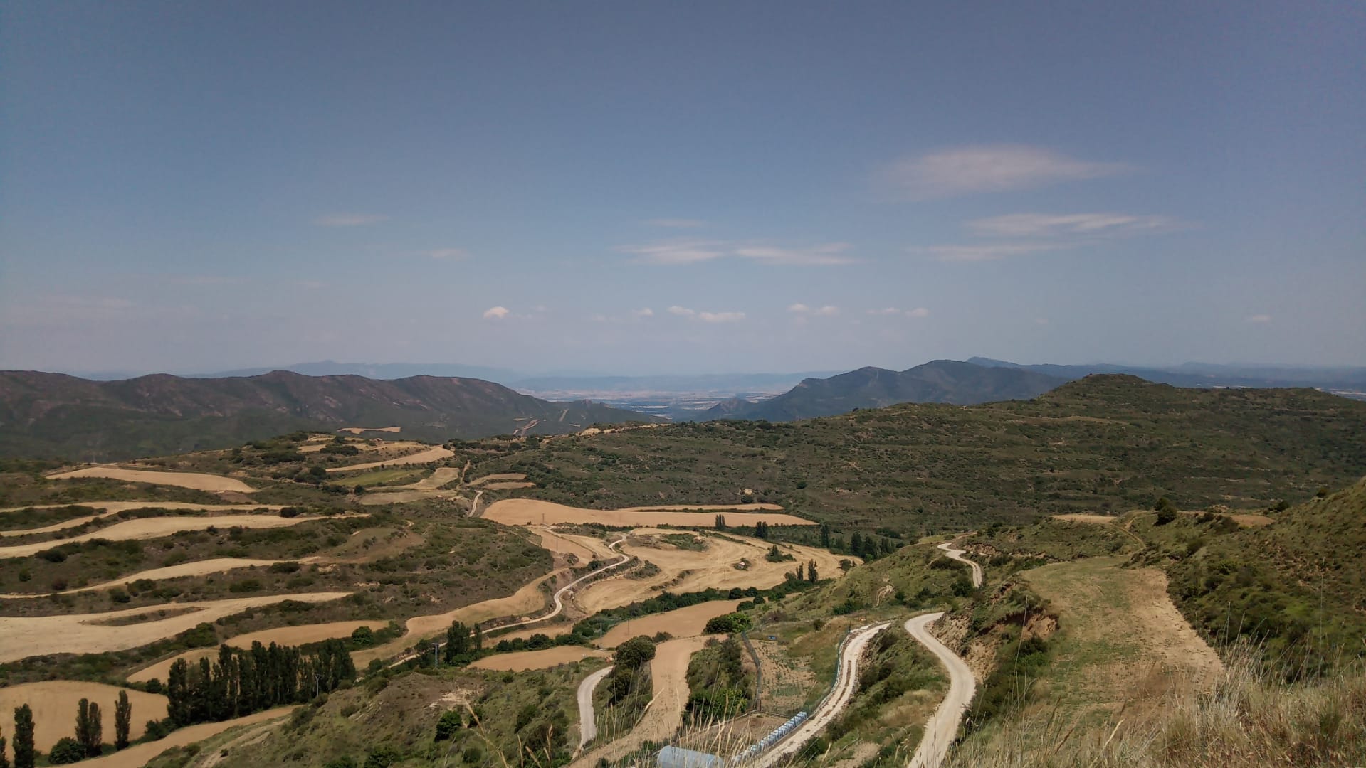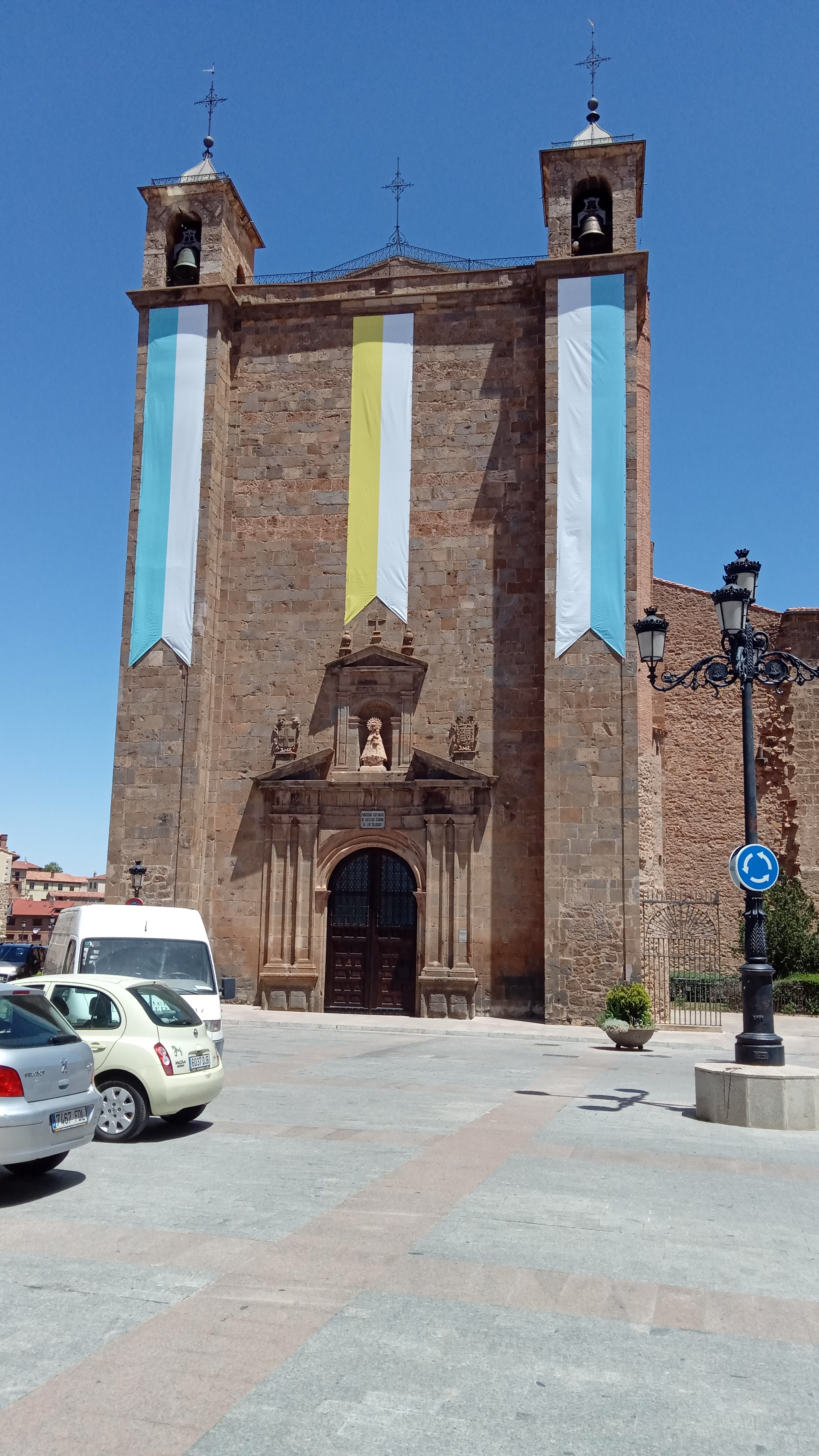Selbstverständlich nehmen wir den Ratschlag der Polizisten gerne wahr und fahren weiter nach Ujué. Die Fahrt führt durchs Hinterland in die Höhe. Der Parkplatz liegt unter dem Dorf hinter einer alten Kirche. Die Aussicht ist der Hammer! Ausser dem Dorf nur Berge und terassenartige Felder. Richtig schön! Der Weg zum Dorf ist sehr steil – und die 34° machen es nicht einfacher – aber die kleinen Pflastersteinwege zwischen den wunderschönen Steinhäusern sind es auf jeden Fall wert. Die grosse Kirche Iglesia de Santa Maria stammt aus dem 16. Jahrhundert und kann kostenlos besichtigt werden. Die Aussicht ist wunderschön – das Gebäude sehr beeindruckend. Ujué hat 3 Restaurants in denen das klassische Migas del Pastor gegessen werden kann. Einen Souvenirshop gibt es natürlich auch. Dort können gebrannte Mandeln, Wein, Gebäck und geweihte Figuren gekauft werden. Ujué wurde als eines der schönsten Dörfer Spaniens ausgezeichnet – absolut zurecht!