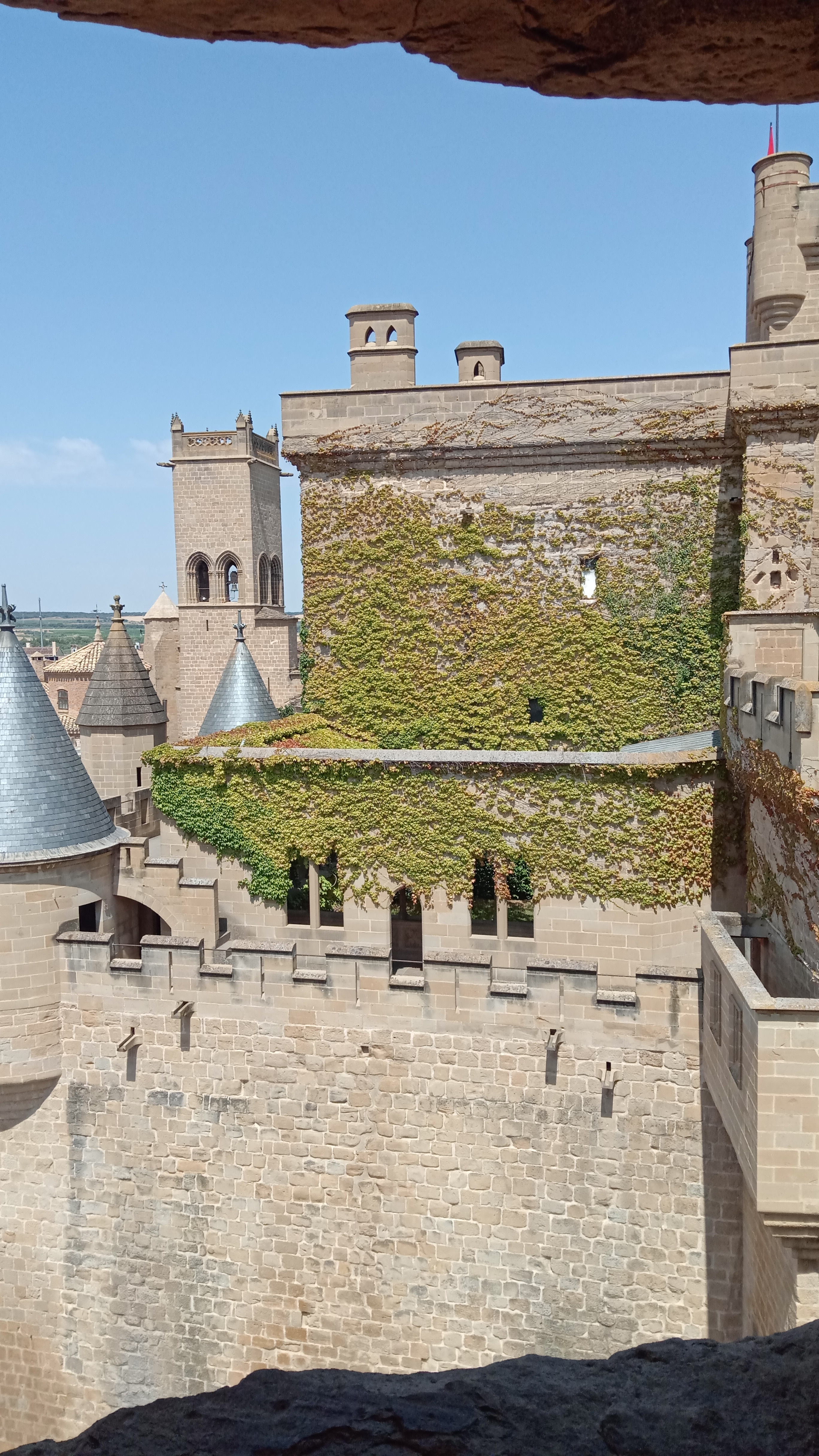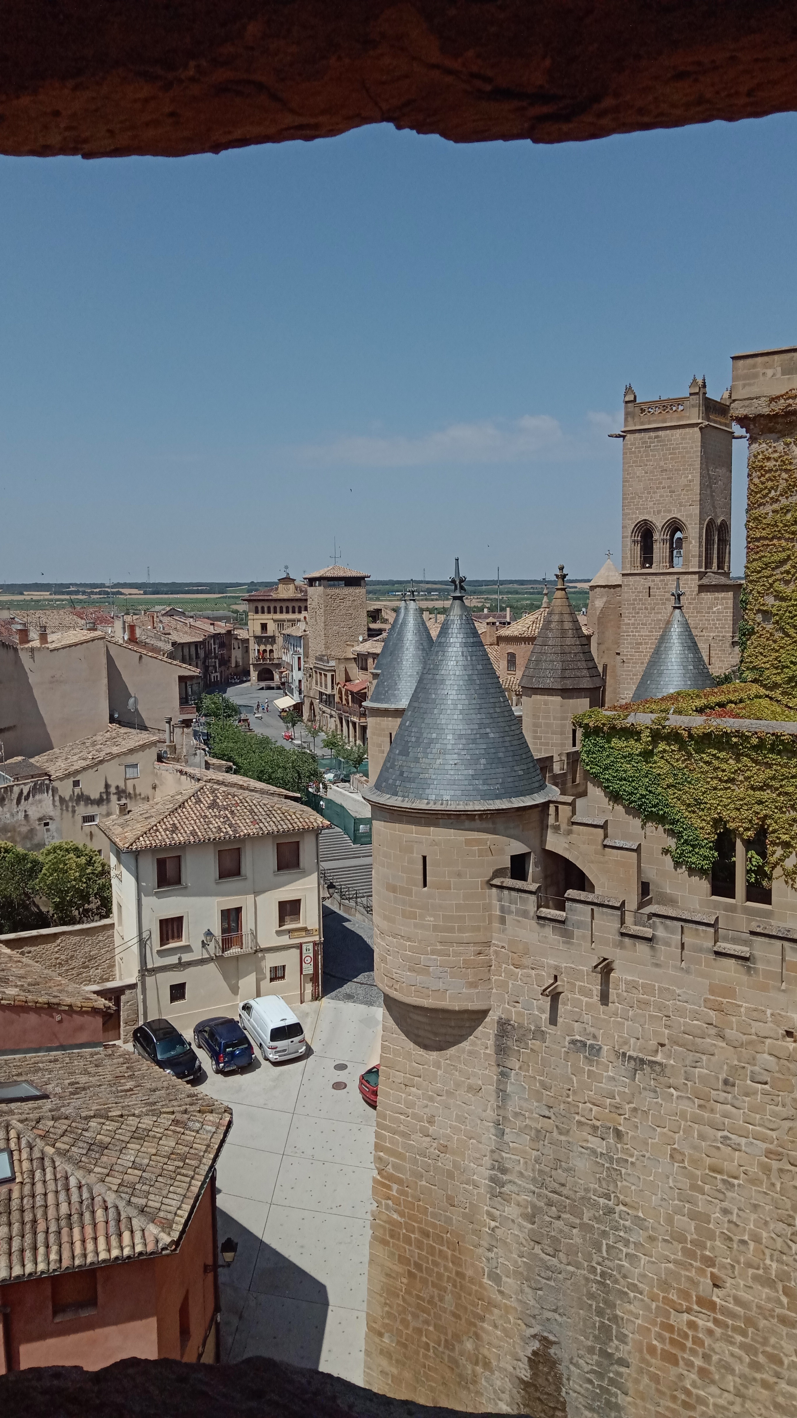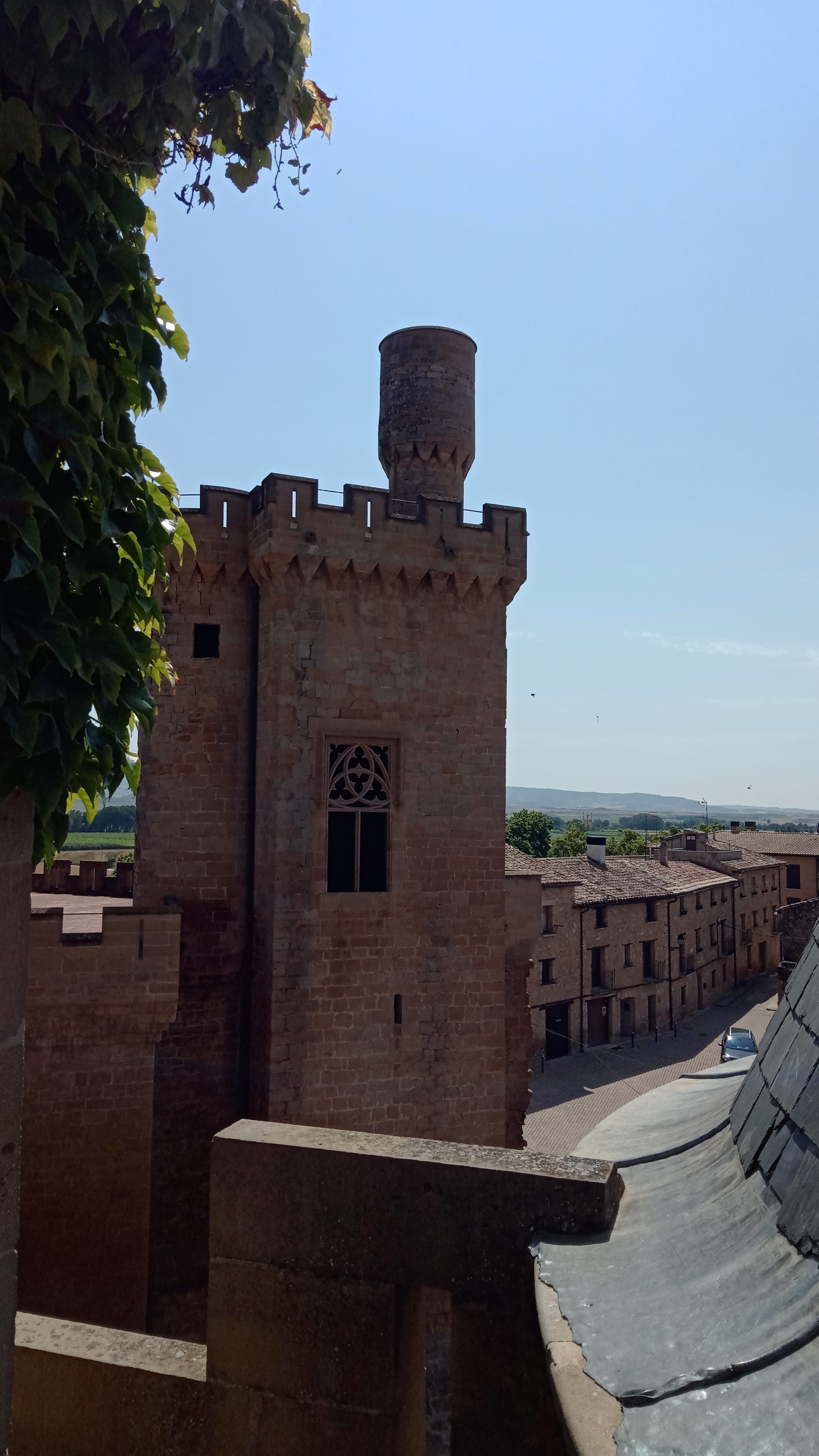 Auf der Suche nach dem nächsten Platz fahren wir zu einem See. Der Parkplatz hatte aber Scherbenreste einer Autoscheibe am Boden und entsprach auch sonst nicht unseren Vorstellungen. Also weiter Richtung Olite. Der Platz befindet sich an einer Hauptstrasse, ist aber trotzdem sehr ruhig. Am nächsten Morgen sah ich eine Uniform draussen. Also gleich raus und gefragt, ob alles in Ordnung ist. Es stellte sich heraus, dass die beiden anhand unseres Nummernschildes nicht herausfinden konnten, wo wir herkommen ;O). Habe dann noch ein bisschen gequatscht mit den beiden – es ist immer von Vorteil, wenn man die Sprache spricht ;o). Sie empfohlen uns, unbedingt noch nach Ujué zu fahren, liegt ca. 20 km weiter. Da wir durch diese unerwartete aber nette Begegnung früh aufgestanden sind, habe ich mich noch aufgemacht, Olite an zu schauen. Der Königspalast ist riesengross und für 3€ Eintritt kann man diesen auf eigene Faust erkunden. Möbel befinden sich keine mehr drinnen aber der Ausblick auf Olite und die Umgebung macht das allemal wett. Die Türme hochzugehen und Fotos zu schiessen hat meinen ganzen Mut gebraucht – aber Grenzerfahrungen sind wichtig! Das Dorf von Olite ist auch sehr schön. Authentische Gässchen mit Steinhäusern prägen das Dorfbild. Natürlich musste ich auch hier in einen Weinladen, wenn man schonmal da ist. Rausgegangen bin ich mit einer Flasche Pacharan, dem Nationalgetränk Navarras mit Schlehdorn. Erfolgreiche Stadtbesichtigung.
