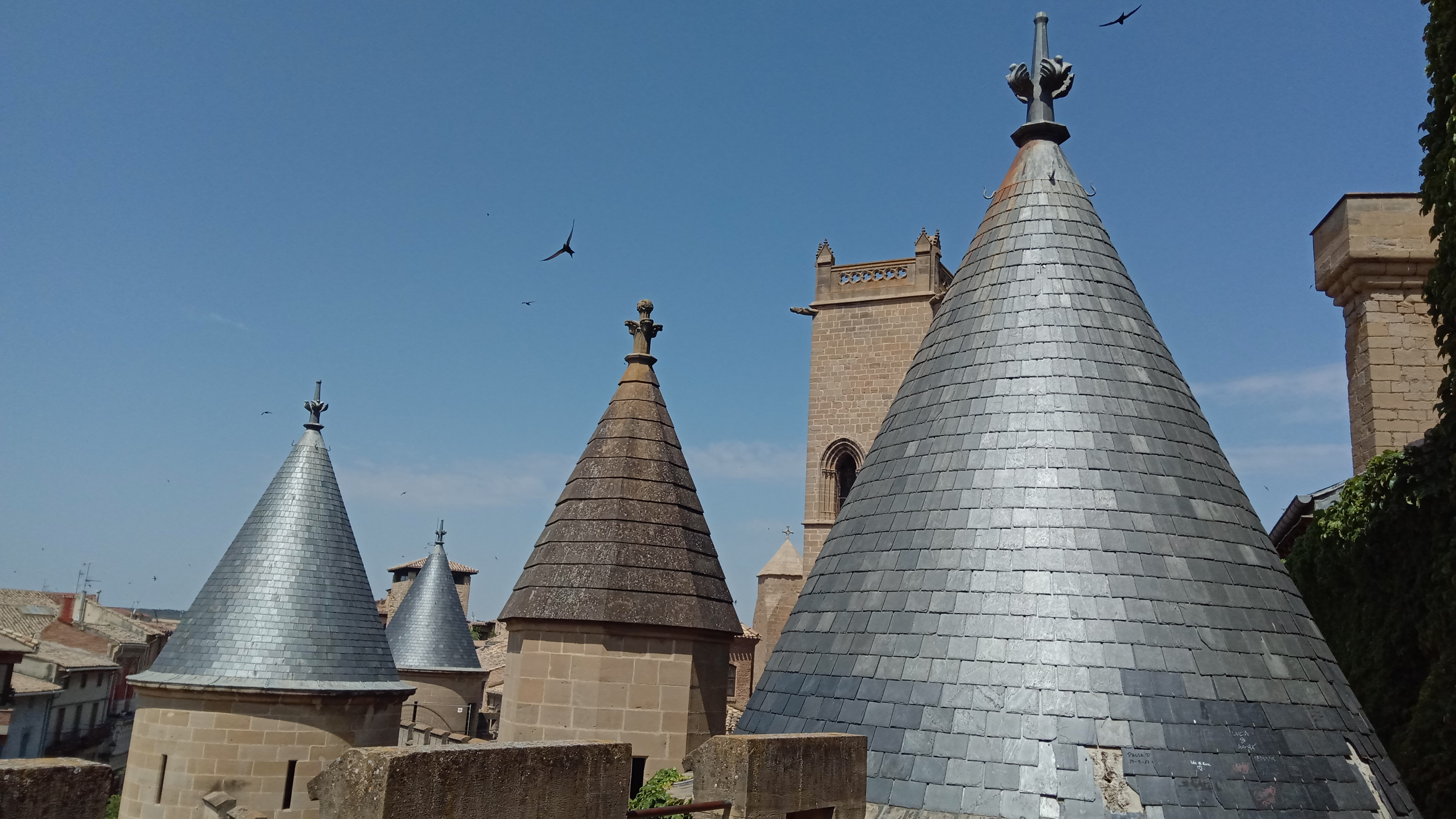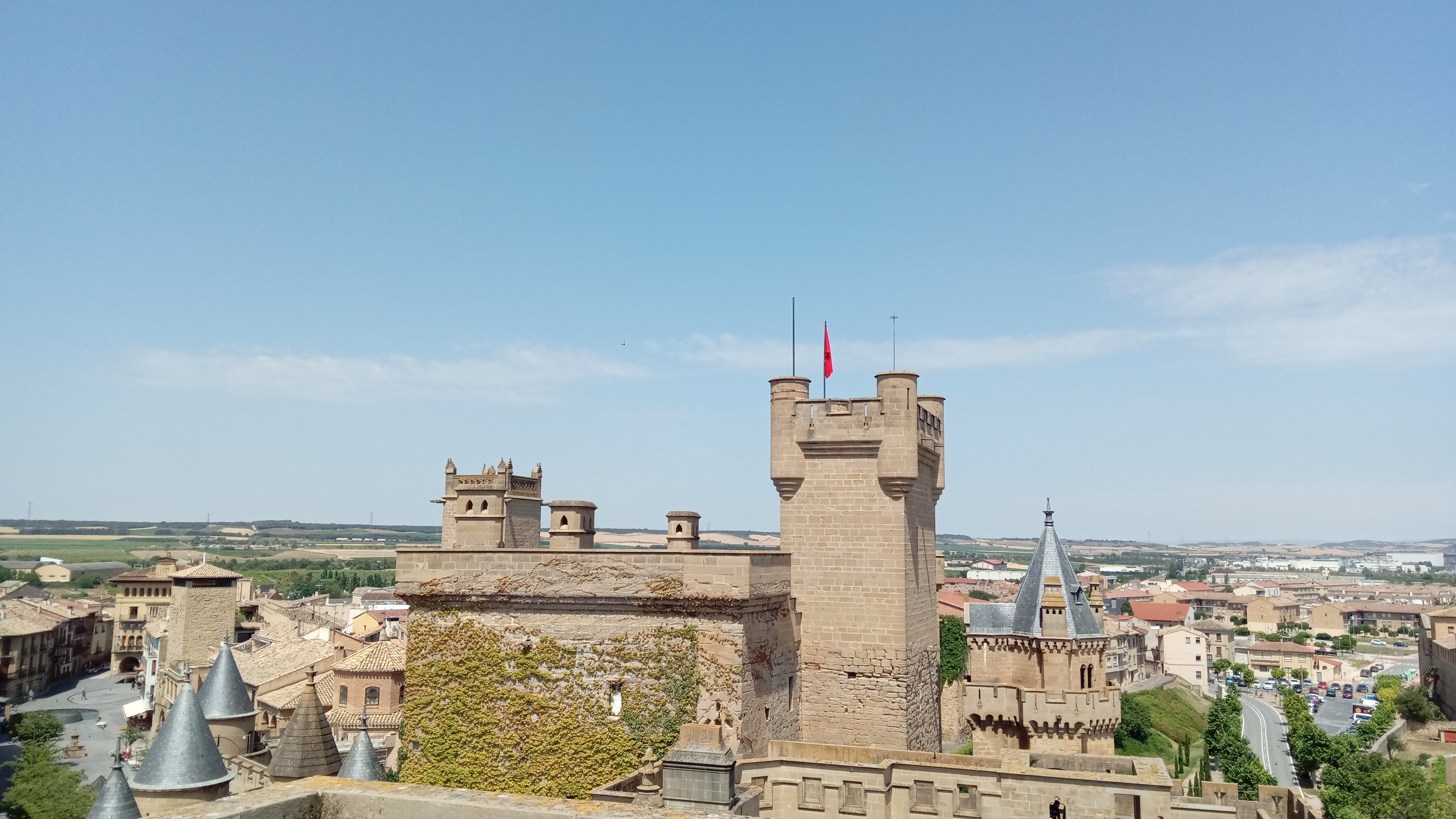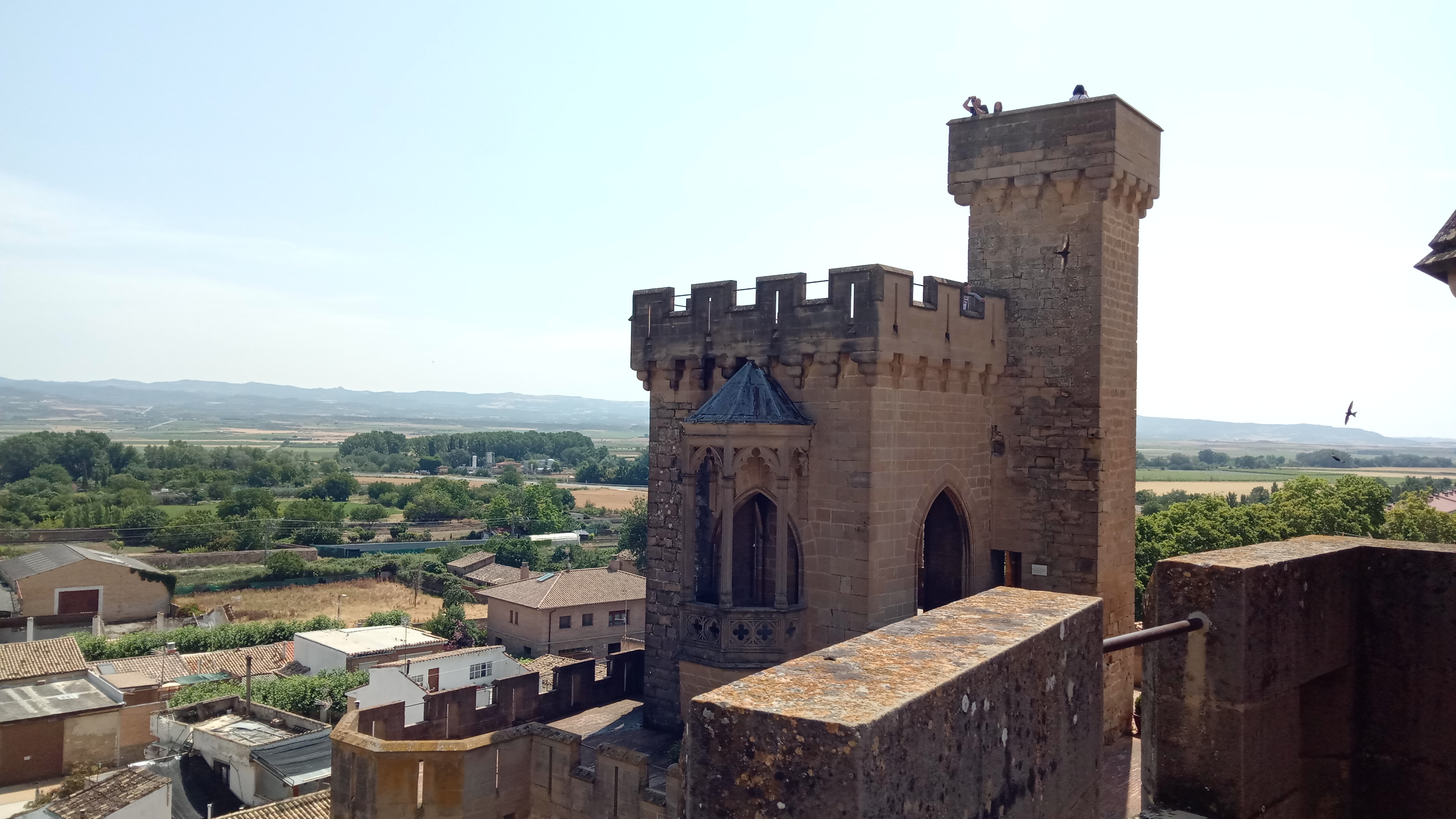 Auf der Suche nach dem nächsten Platz fahren wir zu einem See. Der Parkplatz hatte aber Scherbenreste einer Autoscheibe am Boden und entsprach auch sonst nicht unseren Vorstellungen. Also weiter Richtung Olite. Der Platz befindet sich an einer Hauptstrasse, ist aber trotzdem sehr ruhig. Am nächsten Morgen sah ich eine Uniform draussen. Also gleich raus und gefragt, ob alles in Ordnung ist. Es stellte sich heraus, dass die beiden anhand unseres Nummernschildes nicht herausfinden konnten, wo wir herkommen ;O). Habe dann noch ein bisschen gequatscht mit den beiden – es ist immer von Vorteil, wenn man die Sprache spricht ;o). Sie empfohlen uns, unbedingt noch nach Ujué zu fahren, liegt ca. 20 km weiter. Da wir durch diese unerwartete aber nette Begegnung früh aufgestanden sind, habe ich mich noch aufgemacht, Olite an zu schauen. Der Königspalast ist riesengross und für 3€ Eintritt kann man diesen auf eigene Faust erkunden. Möbel befinden sich keine mehr drinnen aber der Ausblick auf Olite und die Umgebung macht das allemal wett. Die Türme hochzugehen und Fotos zu schiessen hat meinen ganzen Mut gebraucht – aber Grenzerfahrungen sind wichtig! Das Dorf von Olite ist auch sehr schön. Authentische Gässchen mit Steinhäusern prägen das Dorfbild. Natürlich musste ich auch hier in einen Weinladen, wenn man schonmal da ist. Rausgegangen bin ich mit einer Flasche Pacharan, dem Nationalgetränk Navarras mit Schlehdorn. Erfolgreiche Stadtbesichtigung.