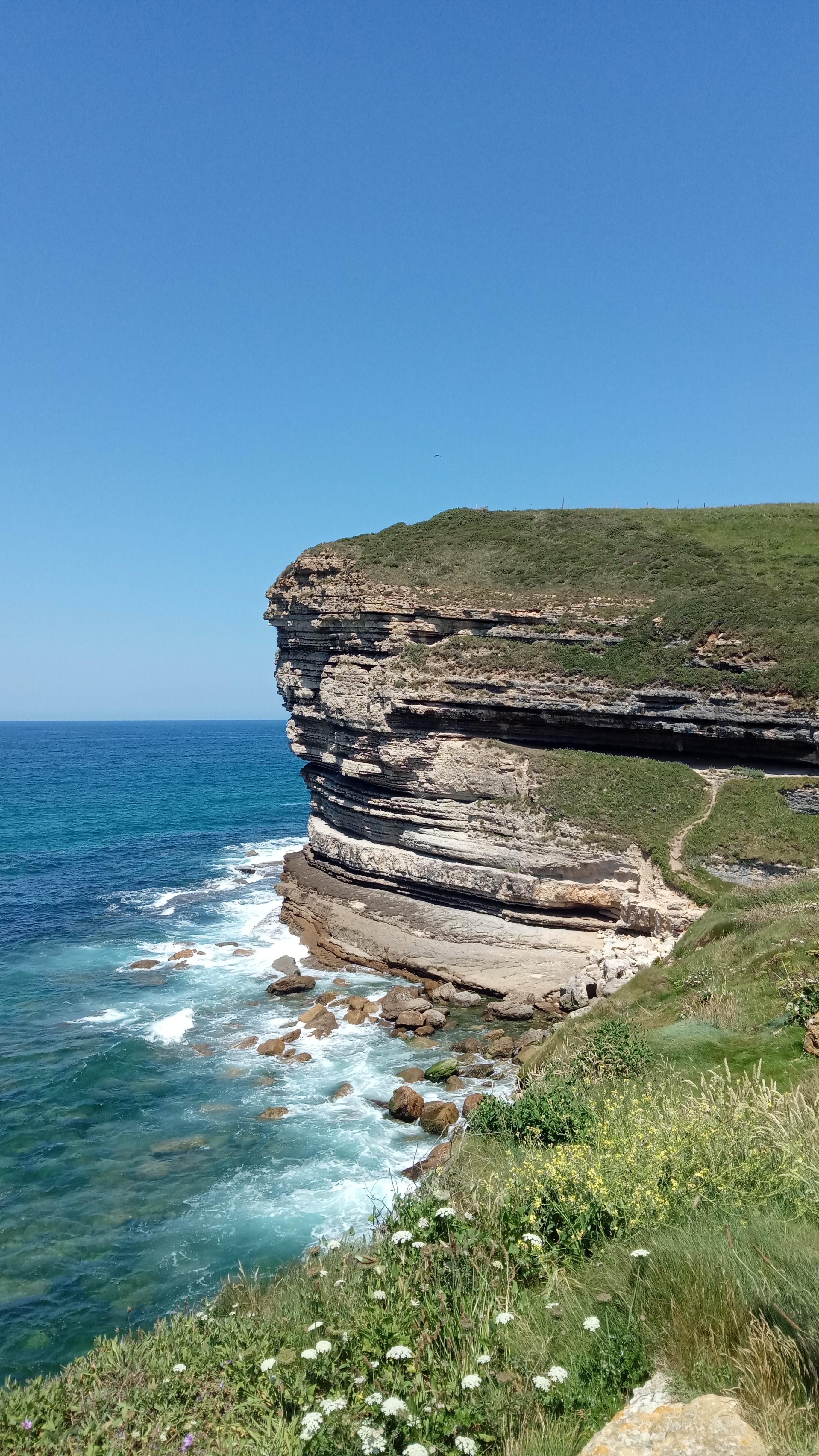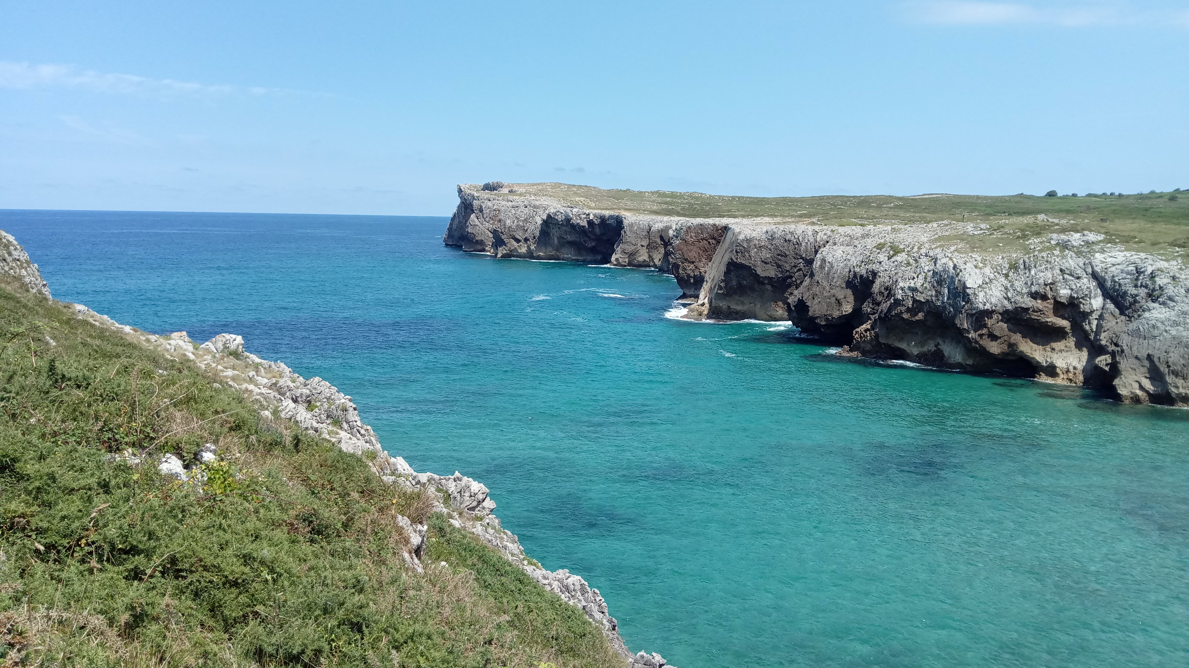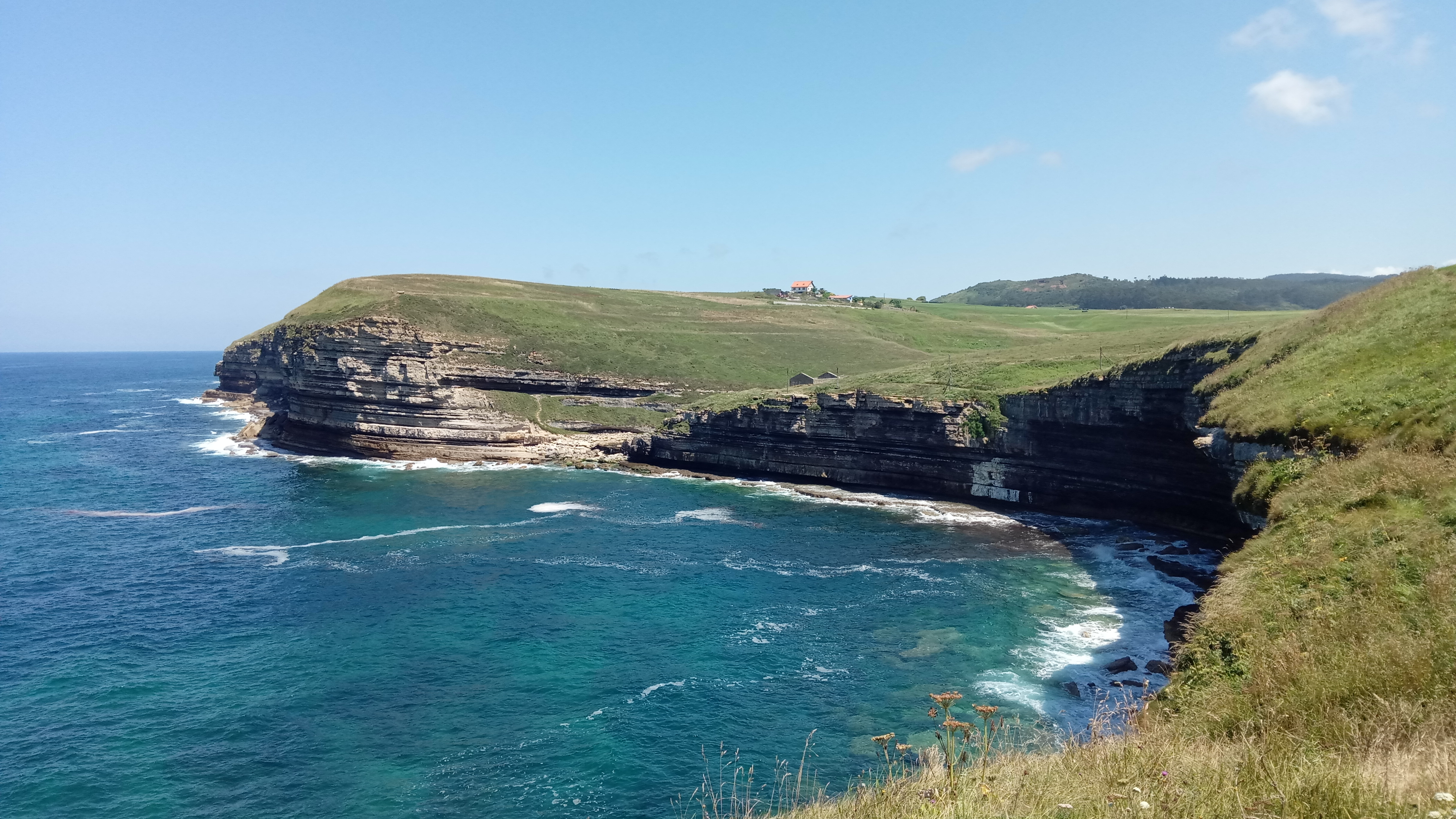 Über Park4night habe ich einen Stellplatz in Cobreces gefunden, der Top bewertet ist. Zudem soll es um die Ecke einen sehr schönen Wasserfall geben – den muss ich sehen. Der Platz ist super, die Betreiberin top und die Lage ein Traum! Auf geht’s zu einer kleinen Wanderung an der Küste Cantabria. Wow – richtig schön! Zum Wasserfall sind es gute 2.5km – leider war der Wasserfall lediglich ein Rinnsal… Naja, die Aussicht ist trotzdem der Hammer. Natürlich lasse ich es mir nicht nehmen, auch den Strand von oben zu sehen. Also entscheide ich spontan, den schmalen Pfad der Klippen entlang zu gehen – und ich bereue es überhaupt nicht!! Einfach nur atemberaubend schön – bis auf die hohen Gräser ;o) Gut habe ich mein Wasser mitgenommen, die Temperaturen haben es nämlich in sich! Tja, dann stehe ich vor einem Elektrozaun – was tun? Unten durchkrabbeln scheint die einzige Lösung. Hätte fast geklappt ohne bzzzz ;o) Tja, weckt Kindheitserinnerungen :O)) Der Ausblick auf den Strand entschädigt die „Strapazen“. Weil ich ja schon unterwegs bin, nehme ich auch gleich die Kirche noch mit bevor ich zurück zu Baerbel marschiere. Absolut sehenswert dieser Küstenabschnitt!
