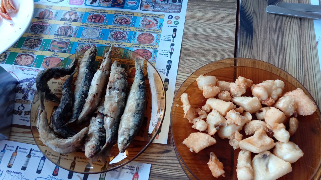 We drive south to Pozo Izquierdo, the windsurf paradise of Gran Canaria. At the surfer beach there is a huge parking lot which is very well visited by camper cars. If you don’t like wind, don’t go there. We like this place as it doesn’t have lots of tourists and very nice restaurants. If you like fish, we recommend the Bar Pozo, situated directly atnext to the ctown center with ocean view. If you rather like a good steak, go to El Rincón. There you also get very good Cuba libres :o). If you are more of a Pizza and fries guy, check out the El Viento next to the back parking lot with stunning ocean view.
