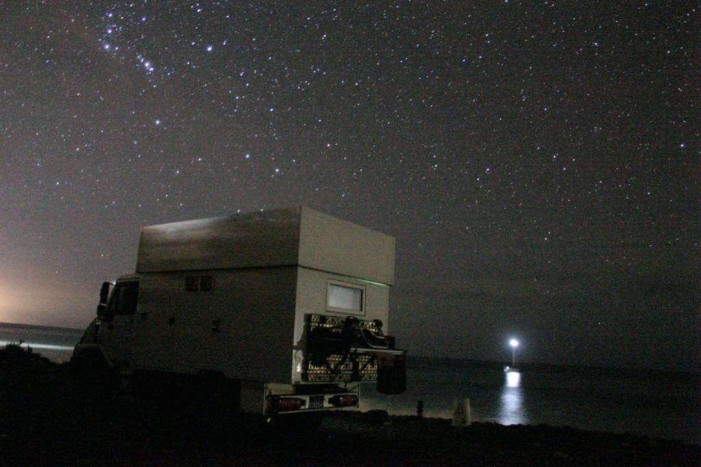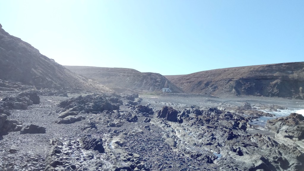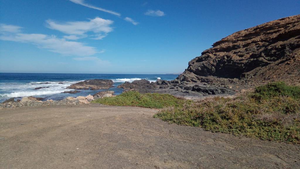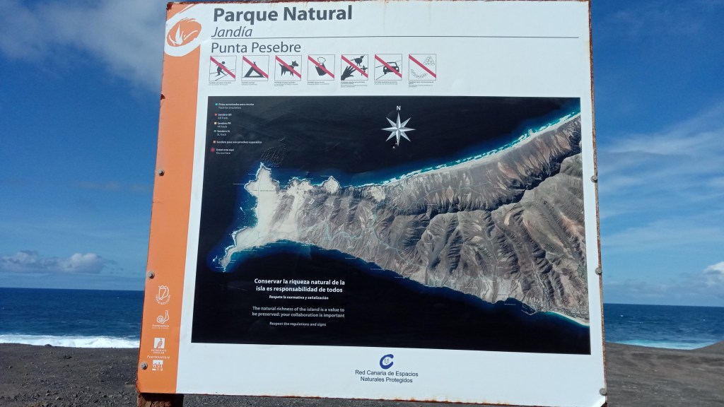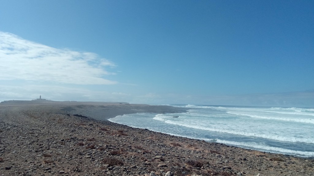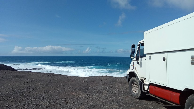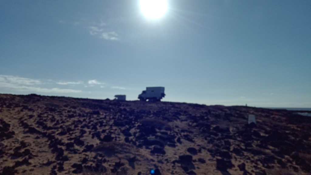 Von Las Palmas aus mit der Fähre nach Morro Jable in Fuerteventura fährt man gute 3 Stunden. Wir haben uns für Armas entschieden, welche für 2 Personen mit Auto 142€ verrechnet hat. Angekommen in Morro Jable suchen wir unseren ersten Stellplatz mit Hilfe von Park4Night. Die Strecke führt uns über die Carretera Punta de Jandia zum Faro de Punta Jandia. Die offizielle Strasse ist eine Schotterstrasse, das richtige Terrain für unsere Bärbel. Der Faro ist sehr schön, allerdings gibt es hier viele Touristen… Wir entscheiden uns daher, etwas zurück zu fahren. An der Playa“El Puertito“ schlagen wir unser Lager aus. Die Lage ist auch perfekt, um unserer Solaranlage zu testen. Fazit: Funktioniert 1a! Nebenan gibt es ein kleines Dorf mit Restaurants und der Möglichkeit, sich mit Brot einzudecken. Die Leute im Dorf sind sehr nett. Ein älterer Mann zeigt mir mit Stolz seinen Garten und sein selbst ausgebautes Haus direkt am Meer.