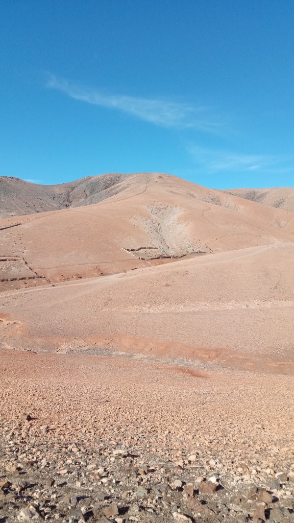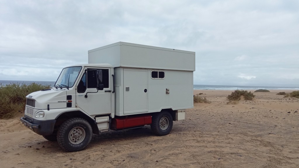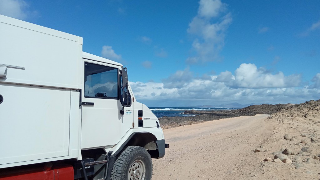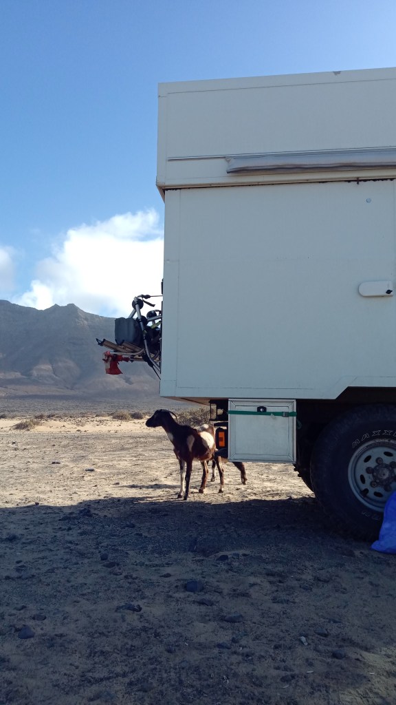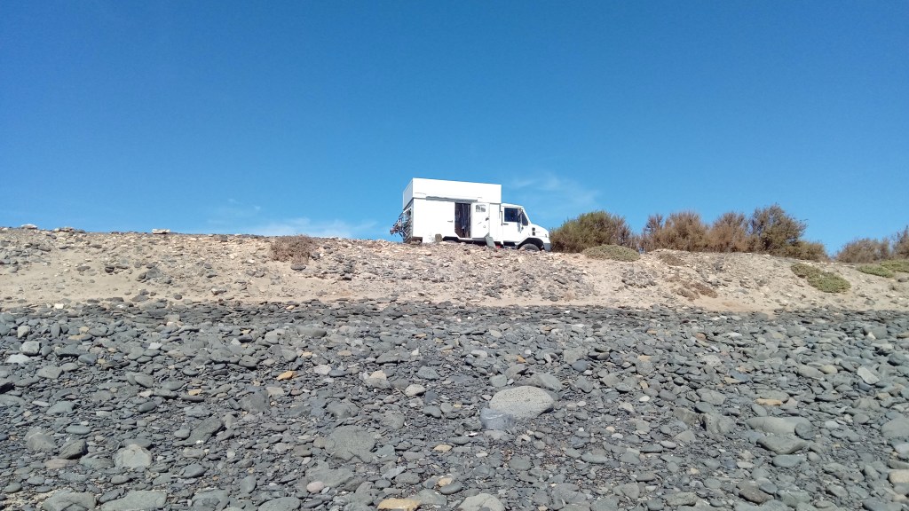 From Las Palmas port to Morro Jable in Fuerteventura the ferry takes about 3 hours. We decieded to go with Armas , who charged us for 2 people with car 142€. Arrrived in Fuerteventura, we look for our first overnight spot using Park4Night. The track leads us over the Carretera Punta de Jandia to the Faro de Punta Jandia. The official street is a gravel road, perfect terrain for our Baerbel. The faro is very beautiful, but there are lots of tourists. .. So we decide to head back to the Playa“El Puertito“ where we find our perfect spot. It is also perfect to test our solar panels. Result: works 100%! It is next ot a small town with restaurants and the possibility to buy bread. The people in the village are very friendly. With a lot of pride an older man showed me his garden and his self build house directly at the beach.