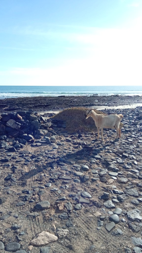 Nächster Halt liegt an der Baja del Junquillo. Der Weg dahin ist lang und führt über eine Schotterstrasse ca. 10 km mit Tempo 20 😉 Der Strand ist nicht schön aber er hat eine Wasserquelle!! Perfekt für eine Aussendusche :o) und diese Ruhe – wir haben 3 Tage keinen Mesnschen gesehen. Entspannung pur. Viel gelesen und die Wellen beobachtet. Und natürlich Ziegen bestaunt :o)