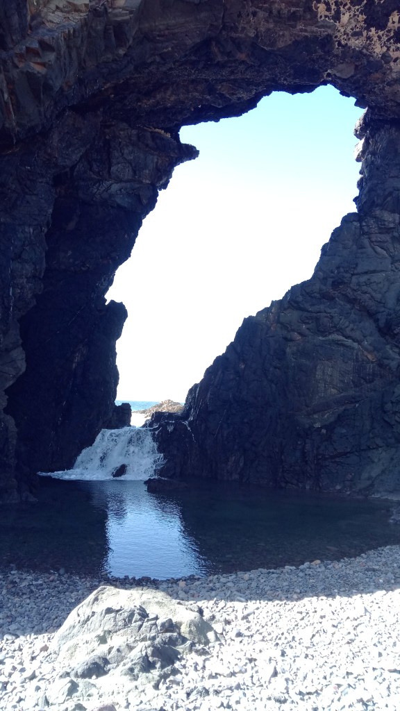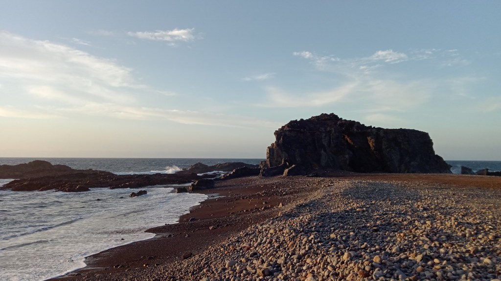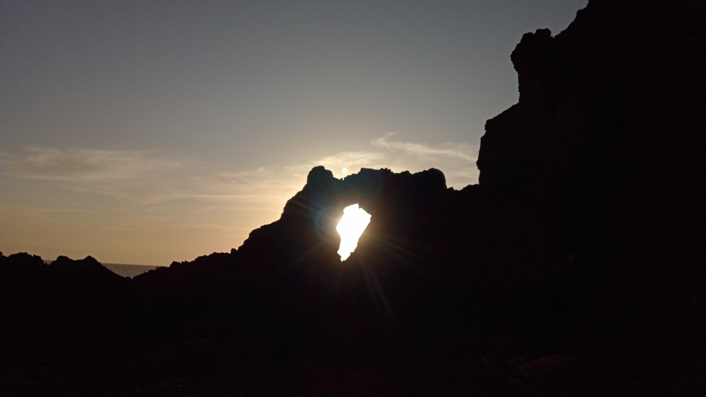 Nächster Halt Ajuy. Über die FV605 fahren wir nach Antigua, wo wir beim Hiperdino nochmals einkaufen. Weiter über die FV621 Richtung Ajuy – In Ajuy befinden sich auf die Cuevas de Ajuy, ein gut besuchter Touristen Hotspot. Wir fahren aber davor ab über eine Schotterstrasse. Wir gingen davon aus, dass wir die einzigen dort sind, da die Strasse echt in einem bescheidenen Zustand war. Aber weit gefehlt, dieser kleine Strand neben der Pena Horada ist gut besucht. Allerdings sind wir am Abend alleine hier. Ein Traum – Auch um Sterne zu beobachten, da hier praktisch keine Lichtverschmutzung die Sicht auf die Sterne beeinträchtigt. Der Felsen von Pena Horada ist echt ein Ausflug wert! Zu was die Natur so im Stande ist, beeindruckt mich immer wieder.