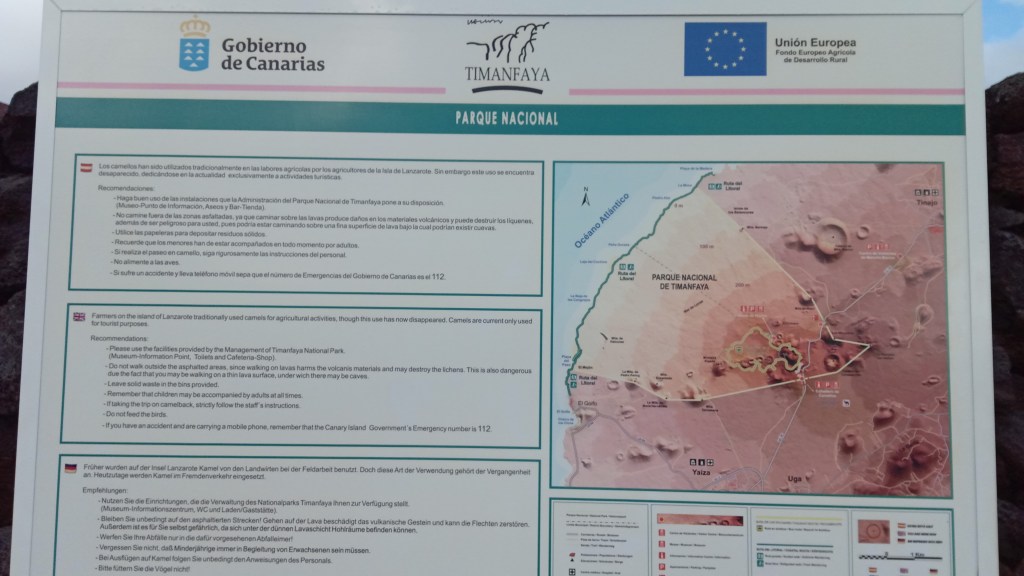 Heute ist es soweit: wir fahren durch den Timanfaya Nationalpark :o) Ich bin echt schon gespannt, wie die Gegend so ist. Wir wissen allerdings, dass wir hier nirgends stehen bleiben können um zu übernachten. Naja egal, Hauptsachte Vulkane schauen. Wir merken auch schnell, dass die Insel viele Touristen anzieht. Wir kommen auch vorbei an der Kamelsafari – kann man machen, muss man aber nicht. Eindrücklich sind die Farben der Vulkane in der Sonne. Von rötlich über braun zu schwarz alles da. Echt beeindruckend.