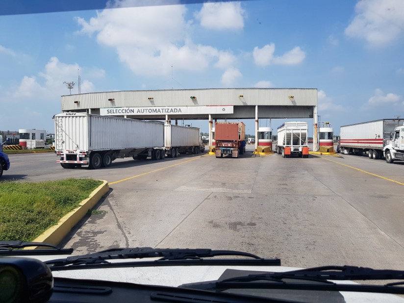 Normalerweise sollten wir spätestens am Tag nach der Inspektion das Auto aus dem Zoll fahren können, doch leider hielt der mexikanische Zoll es nicht für sooo eilig und es wurde dann Mittwoch Vormittag. Wieder das selbe Prozedere: Durch die Sicherheitsschleuse und dann mit dem Agenten zum Wohnmobilplatz. Wir verabschieden uns vom Agenten und fahren los. Dachten eigentlich, wir sind gleich draussen – Pustekuchen! Wir standen noch gute 2 1/2 Stunden mit LKWs aller Art in der Schlange, bis wir endlich zuerst bei einer Röntgenstelle durchfahren (drückt auf den Knopf damit die Ampel grün wird 🙈) zum 1. „Schalter“ gelangen. Hier werden die Papiere, also das Banjercito und sämtliche Papiere, welche mit dem Banjercito bestätigt wurden, abgegeben und dann wird gewartet. Eine gefühlte Ewigkeit später öffnet sich die schwarz getönte Scheibe wieder, die Papiere werden wieder ausgehändigt und man darf zum 2. „Schalter“ fahren. Fenster geht auf, die selben Papiere gehen nochmals rein und ihr wartet. Dann endlich können wir los!