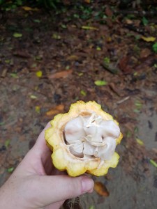 Unser nächster Halt ist eine Kakaofarm in Comalcalco. Mich beschäftigt weiterhin das Thema Gaskocher, da wir für unsere Campinggaz Flaschen bis dato noch keinen Adapter gefunden haben. Zudem ist es viel zu heiss, um im Auto zu kochen! Leider sind wir bis jetzt noch nicht fündig geworden… Naja, gibt es halt derweil nur kalte Kost oder eben noch mehr schwitzen im Auto 😆 Die Kakaofarm heist Hacienda Jesus y Maria. Wir dürfen auf dem Parkplatz stehen bleiben und werden dann gleich am kommenden Vormittag einen Rundgang machen. Die Farm baut ihren Kakao vollständig biologisch an. Diese Früchte mal in echt zu sehen und auch roh zu kosten war ein mega Erlebnis. Die rohe Kakaobohne ist weiss und von einer schleimigen Schicht umgeben. Sie schmeckt leicht säuerlich aber der Kakao kann bereits in diesem Zustand erkennbar. Die Kakaoernte erfordert viel Zeit und Handarbeit. Eine Kakaopflanze trägt erst nach 3 Jahren die ersten Früchte und kann bis zu 30 Jahre alt werden. Kakao kann 2x im Jahr geerntet werden. Die Tour führt auch durch eine kleine Gärtnerei, in welcher unter anderem auch Zimt angebaut wird. Es gibt auch eine kleine Führung durch die ursprünglichen Hütten der Vorfahren. Kakao in der heutigen Form wird seit 1987 angebaut. Die daraus entstandene Schokolade heisst Cacep und ist eine der besten, die wir bis jetzt in Mexiko gefunden haben – ja, wir haben im Shop gehörig zugeschlagen. Am Ende der Führung durften wir dann aus den gerösteten Kakaobohnen, Zimt und Zucker unsere eigene Schokoloade herstellen. Es war echt spannend, das alles zu erleben.