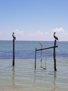 Nun geht es für uns, um einige Portionen Schokolade im Kühlschrank reicher, weiter nach Isla Aguada. Die Fahrt führt am Golf von Mexiko entlang über la Cuidad del Carmen – viel Gewusel, viele Leute und viel Verkehr – über eine mautpflichtige Brücke nach Isla Aguada. Der Platz liegt nahe der Strasse direkt am Meer. Die Übernachtung inklusive Klos, Dusche und Strom liegt bei 300 Mxn – also ca. 13€. Auf dem Platz gibt es ein Restaurant. Das Essen ist ganz OK, der Service naja… Im Ort gibt es eine super Wäscherei. Doch das Beste: Die spektakulären Sonnenuntergänge begleitet von Delfinen 😍😍