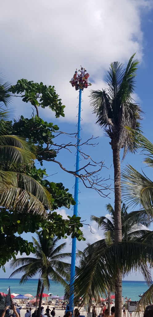 Von Puerto Morelos aus schnappen wir uns ein Taxi nach Playa del Carmen. Wir schlendern die bekannte Avenida quinta entlang vorbei an tausenden Souvenirshops mit immer den selben Sachen: Ponchos, Totenköpfen, Tequila, Zigarren, Taschen und sonstigem Klimmbimm (oder auch Nippes, wie wir gelernt haben). Extrem viele Leute sind unterwegs. Am Parque de las Fundadores tut sich was. Wir kriegen eine Show der Voladeros. Die Voladeros stammen meist von den Olmeken und Totonaken ab, welche hoch oben in der Luft einen zeremoniellen Tanz zelebrieren. Vermutlich geht dies auf einen Fruchtbarkeitskult zurück, um den Ertrag der Feldfrüchte zu steigern und die Fruchtbarkeitsgötter Tlazoltéotldes und Xipe Totec zu ehren. Seit 2009 ist dieser Fliegertanz von der UNESCO als Immatrielles Kulturerbe anerkannt. Auf jeden Fall sehr beeindruckend, was die Voladores da veranstalten – da gibt man auch gerne etwas Trinkgeld.