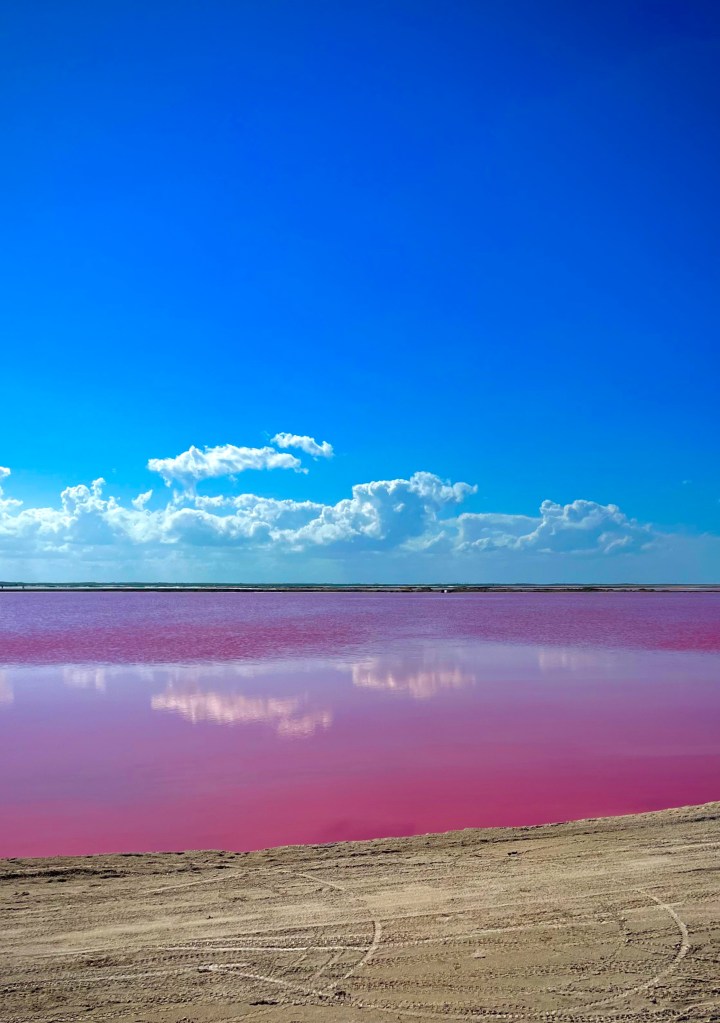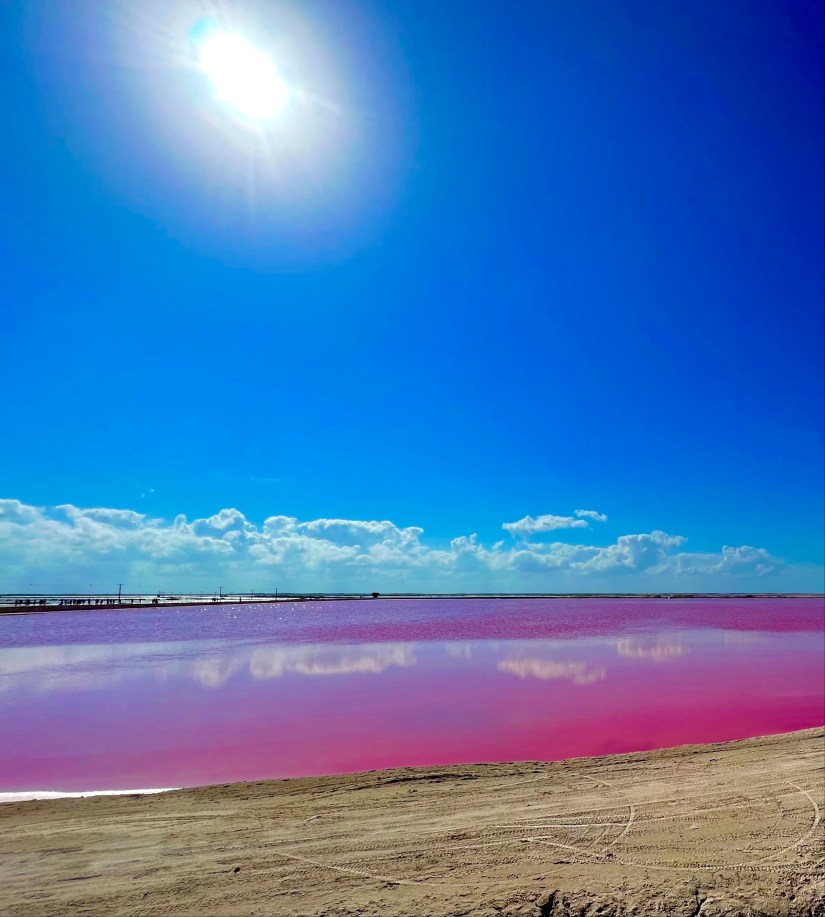 Etwas weiter östlich von Rio Lagartos befindet sich las Colorados. Es handelt sich hier um künstlich Salzbecken, welche durch bestimmte Bakterien Pink eingefärbt sind. Es sieht ganz tolll aus, ist aber auch sehr touristisch angelegt. Unser Taxifahrer erzählt uns, dass momentan eine Mauer gebaut wird, welche die Sicht auf die Salzfelder zukünftig nur noch gegen Bezahlung ermöglicht. Aktuell würde eine Tour 350 MXN / pP kosten. Wäre uns das Geld nicht wert.