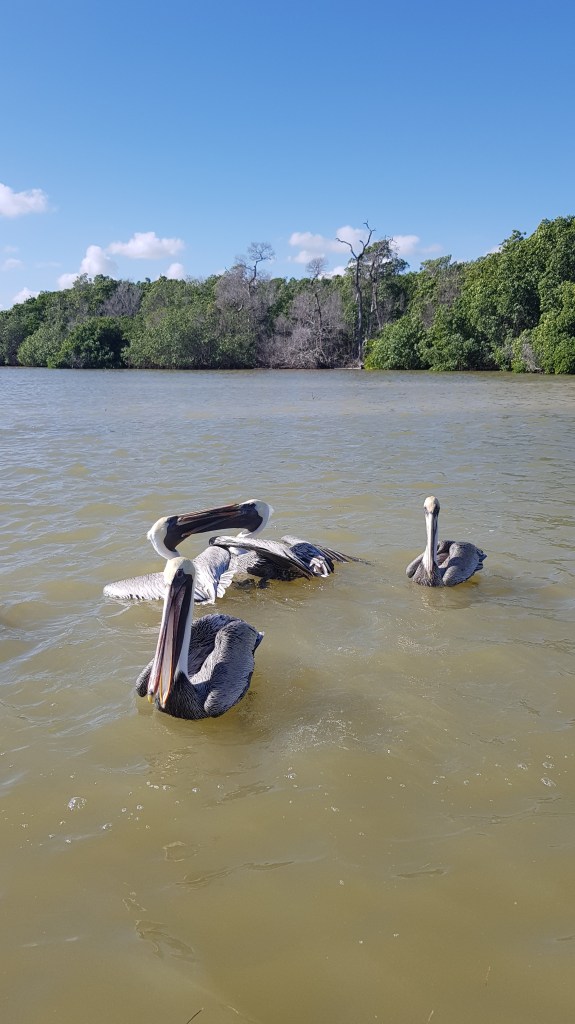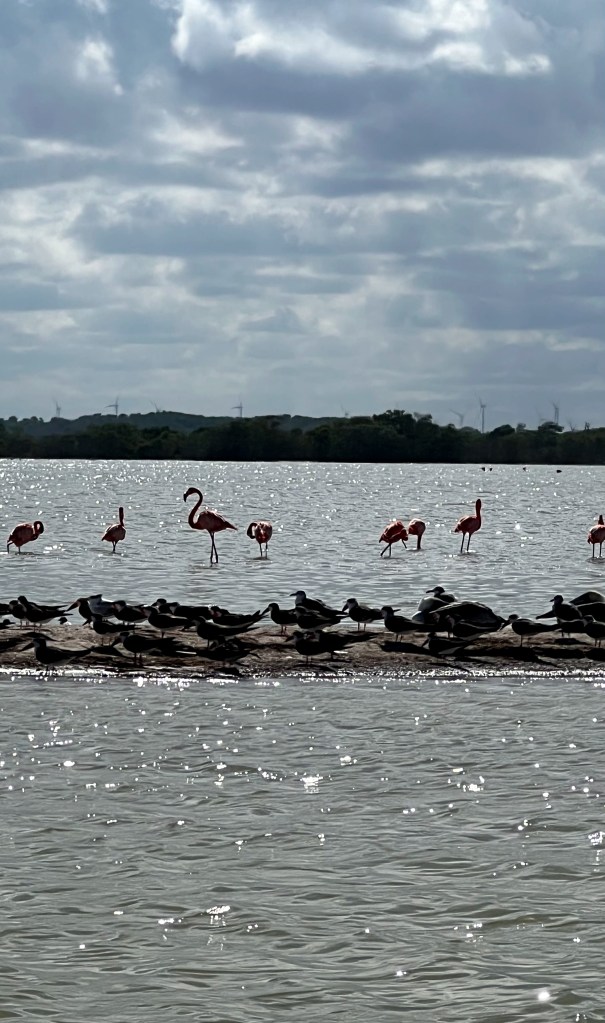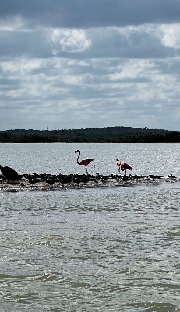 Die Fahrt von Valladolid dauert ca. 1 1/2 Stunden. Rio Lagartos ist ein kleines Fischerdorf am Nordufer der Halbinsel. Hier ist die grösste Dichte an Flamingos in ganz Mexiko zu finden. Zu verdanken ist dies dem Reserva de la Bisofera Ría Langartos, die ein Gelände umgeben von Mangroven Schutz für die Flamingos aber auch für viele weitere Vogelarten (bis 400 Arten) bietet. Der Ort lebt von den Bootstouren hat aber sonst relativ wenig zu bieten. Auch wir machen eine Bootstour in der Hoffnung, grosse Krokodile und Flamingos zu sehen. Die Flamingos sehen wir, auch ein paar eher kleinere Krokodile. Danach haben wir die Gelegenheit, ein klassisches Mayabad zu nehmen – also faktisch eine Art Schlammpackung. Diese trocknet dann währende der Bootstour richtig schön ein. Deshalb führt uns die Tour an einen schönen kleinen Sandstrand um diesen Schlamm wieder abzuwaschen. Nach der Bootstour bleibt uns noch etwas Zeit für eine kleine Mahlzeit im nahe gelegenen Fischrestaurant. Die Preise hier sind eher teuer, da das Publikum hauptsächlich aus Touristen besteht. Aber dennoch lecker.