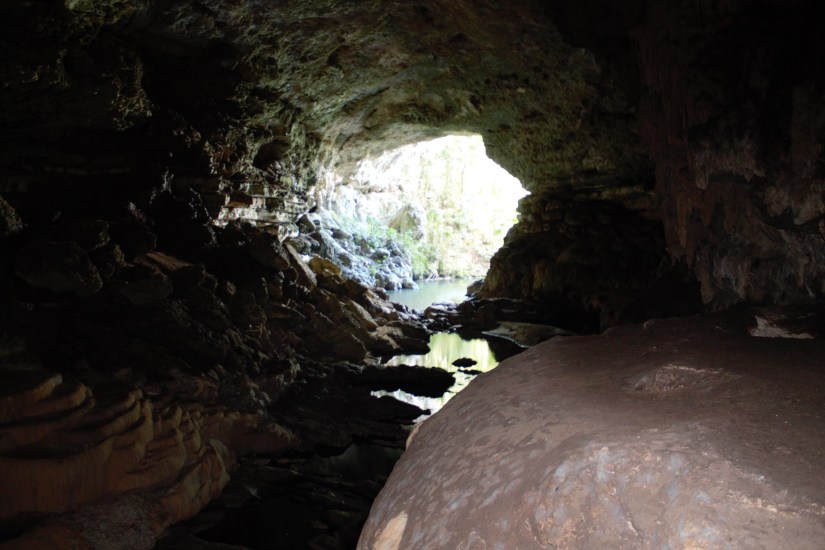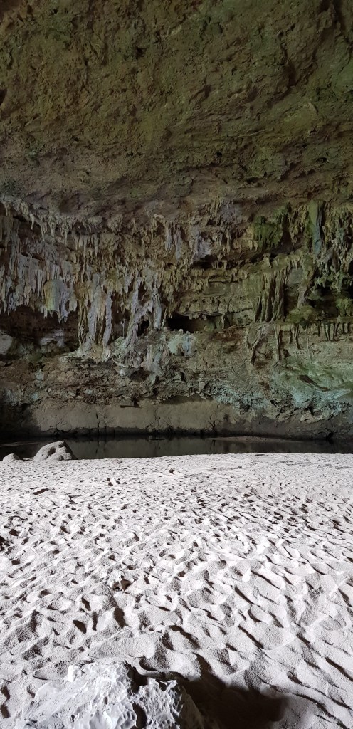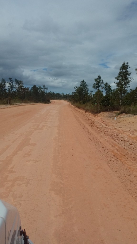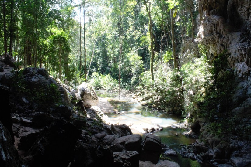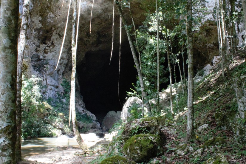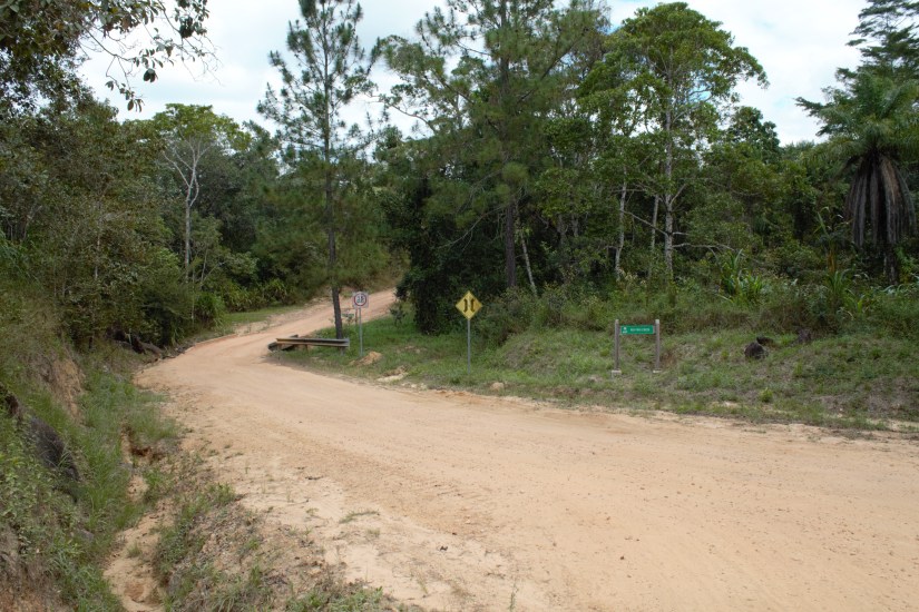 O wow – what a ride 😎 Die Strecke ist zwar kilometertechnisch nicht weit, allerdings hört die schöne Asphaltstrasse ziemlich schnell auf und man befindet sich auf einer verdichteten Lehmpiste mit diversen ziemlich tiefen Löchern, engen und steilen Abschnitten sowie ausgewaschene Querrillen. Also bei Regen absolut unfahrbar! Für unsere Baerbel das richtige Terrain und die Gegend ist traumhaft schön. Die Kiefern in Kombination mit dem roten Lehmboden – ja das kann schon was. Wir fahren gute 25km bis zur Rio Frío Cave. Diese liegt direkt an der Zufahrtstrasse zur Caracol Ruine. Soweit wollten wir dann doch nicht runter fahren. Die Fahrt zur Höhle führt durch eine Art Geisterdorf. Vermutlich wurde dieses aufgrund der Militärbasis aufgegeben. Die Rio Frío Höhle ist echt beeindruckend inmitten des Regenwalds gelegen. Es gibt noch weitere kleinere Höhlen, die sogenannten Twin Caves A und B. Die eine liegt direkt neben der Strasse und die andere ca. 5 Minuten Fussmarsch im Regenwald.