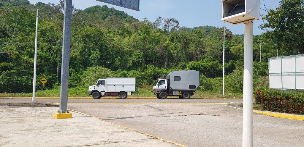 An der Grenze angekommen parken wir unsere Baerbel mal auf dem Parkplatz. Von dort aus sieht man zwei Gebäude direkt gegenüber und eines etwas weiter rechts Richtung Guatemala. Es ist uns nicht so ganz klar, wo wir hin müssen. Also gehen wir in das linke Gebäude gegenüber des Parkplatzes, aber das ist komplett leer. Ok weiter geht’s zum rechten Gebäude. Hui da hat es aber viele Leute im Wartesaal. Die Beamten vor dem Gebäude sagten uns wir sollen drinnen nachfragen, wo wir hin müssen. Dort wurde uns dann mitgeteilt, dass wir zu dem Gebäude weiter rechts Richtung Guatemala gehen müssen. Über den Fussgängerweg gelangen wir zum Gebäude. Dort angekommen wurde uns gesagt, dass wir mit Baerbel hierher fahren müssen. Also wieder zurück zum Auto und die paar Meter bis zu diesem Gebäude bzw. etwas danach vorfahren.