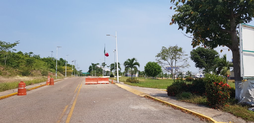 So, jetzt kann die eigentliche Ausreise losgehen. Jeder wird einzeln in das kleine Grenzhäuschen gebeten – mit Maske versteht sich. Es wird das FMM – die Touristenkarte – und der Stempel im Pass überprüft. Dann wird man ausgestempelt und das war’s. Da wir unser TIP – also das temporary import permit für Baerbel nicht löschen wollen, müssen wir für das Auto nichts machen. Ansonsten hätte man im ersten Gebäude beim Banjercito diese Dokumente abstempeln sollen.